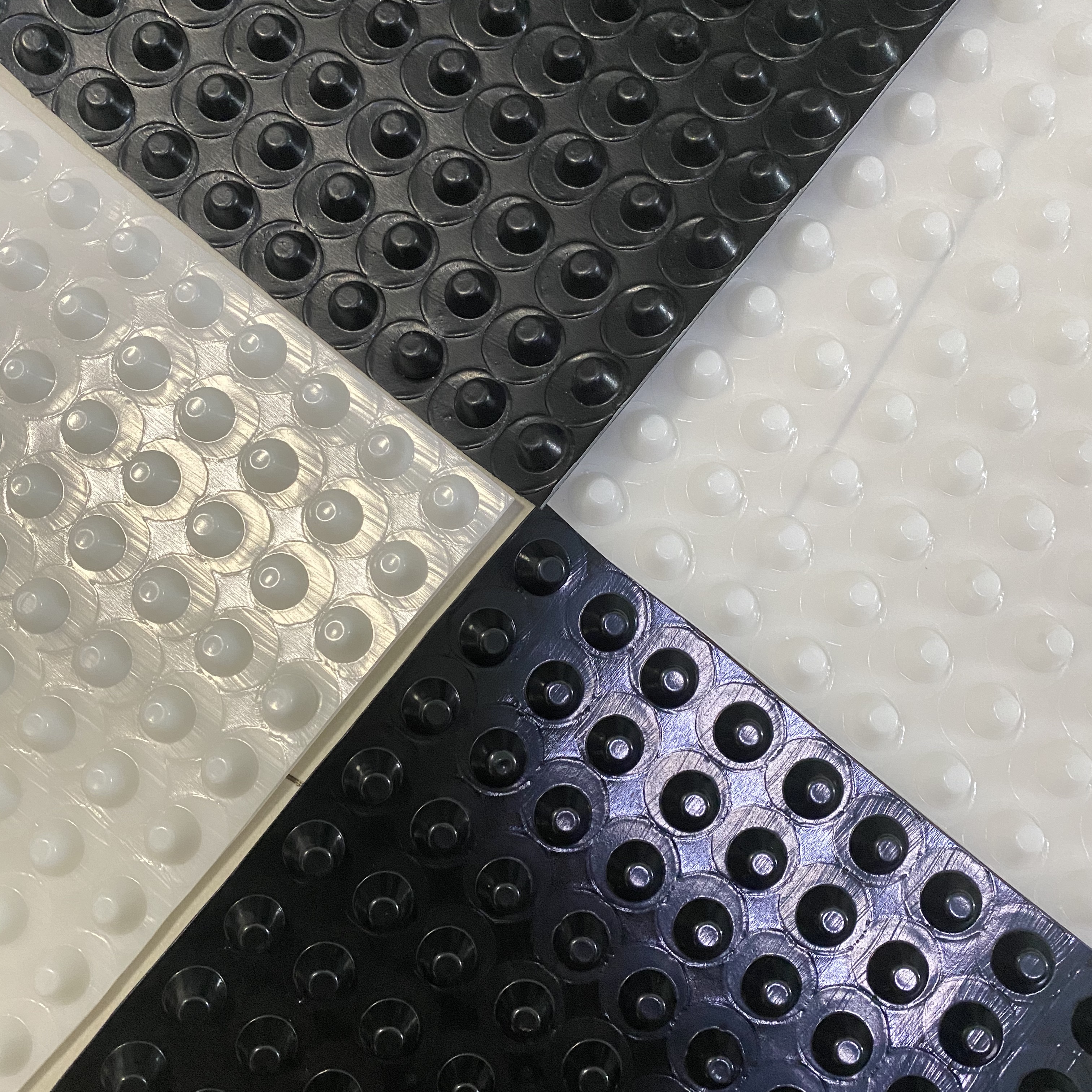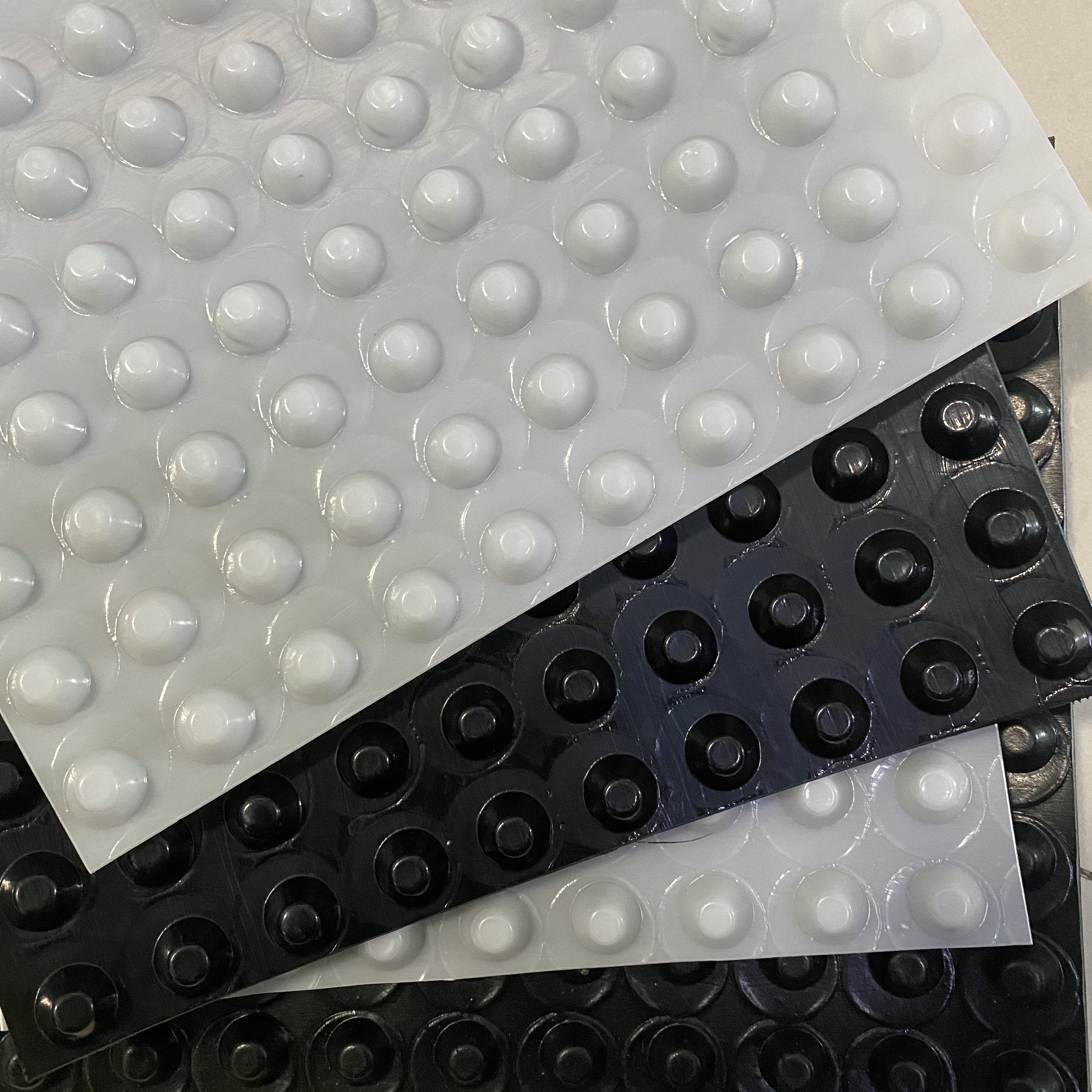 排水板 是由聚苯乙烯(HIPS)或者是聚乙烯(HDPE)為原料塑膠底板經(jīng)過沖壓制成圓錐突臺(tái)或者加勁肋的凸點(diǎn)(或中空?qǐng)A柱形多孔)而成,經(jīng)過不斷的創(chuàng)新研發(fā)原料得到巨大提升和變更,現(xiàn)由聚氯乙烯(PVC)為原料壓制而成,抗壓強(qiáng)度和整體平整度得到大幅度的提升,幅寬有1~3米,長(zhǎng)度有4~10米或者以上。