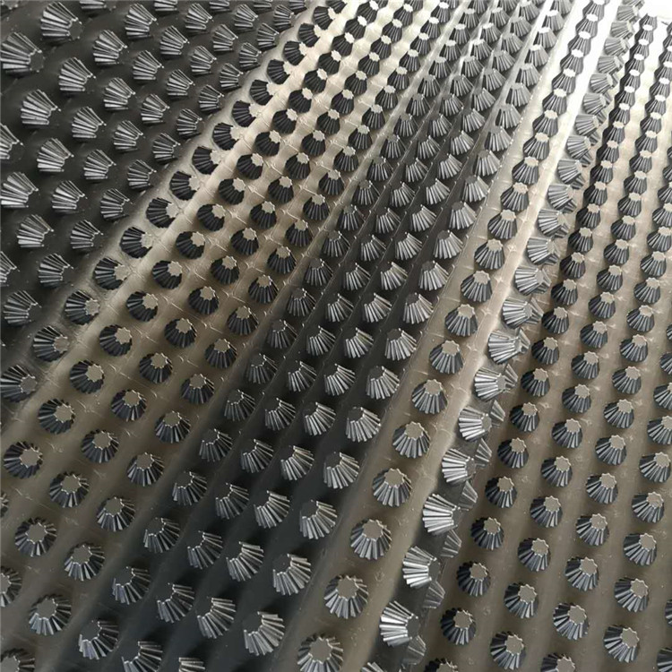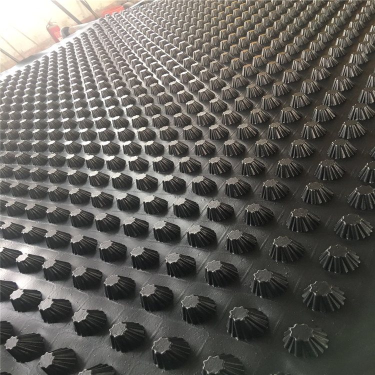 圓錐突臺(tái)的頂面膠接一層過(guò)濾土工布,以阻止泥土微粒通過(guò),從而避免排水通道阻塞使孔道排水順暢。 傳統(tǒng)的排水方式使用磚石瓦塊作為導(dǎo)濾層、使用較多的鵝卵石或碎石作為濾水層、將水排到指定地點(diǎn)。而用排水板取代鵝卵石濾水層來(lái)排水則省時(shí)、省力又節(jié)能、節(jié)省投資、還能降低建筑物的荷載。